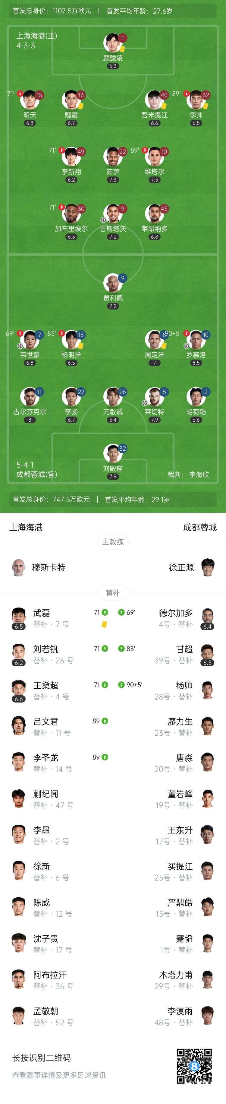 联赛首败!海港主场1-3蓉城 韦世豪弑旧主武磊复出登场+假摔染黄
