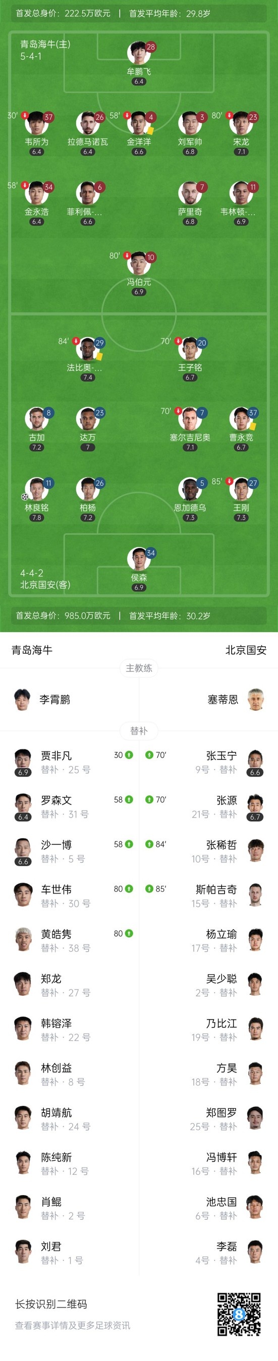 下半场补时6分钟,青岛海牛1-1北京国安。