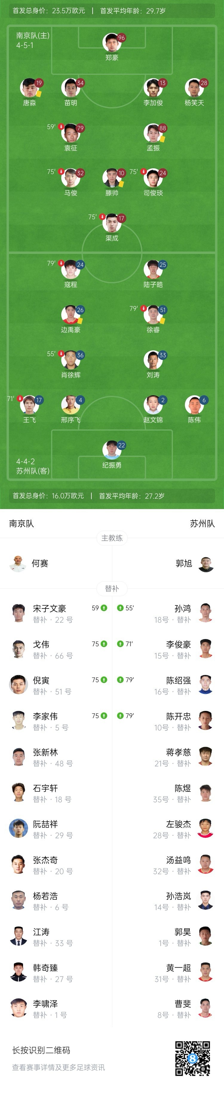 全场比赛结束,南京队主场0-0战平苏州队。
