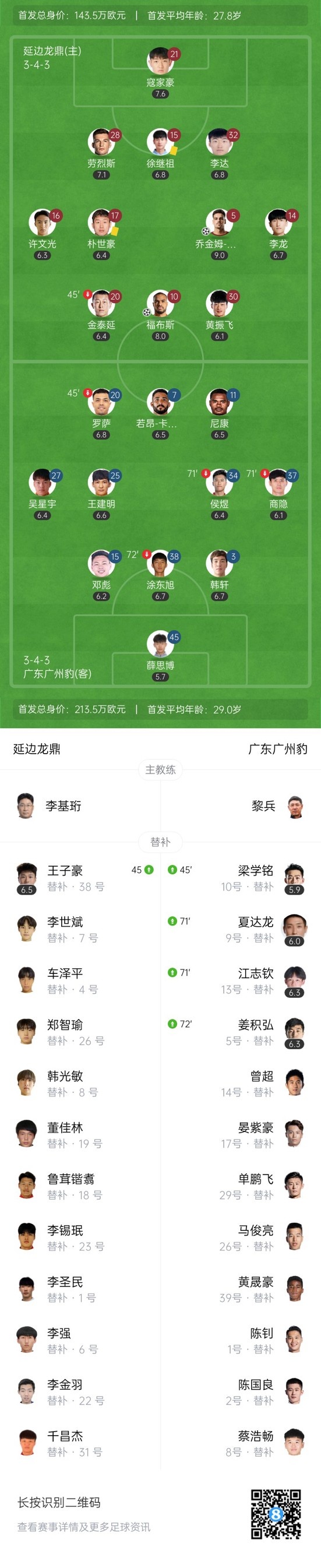 下半场补时5分钟,延边龙鼎2-0广东广州豹。