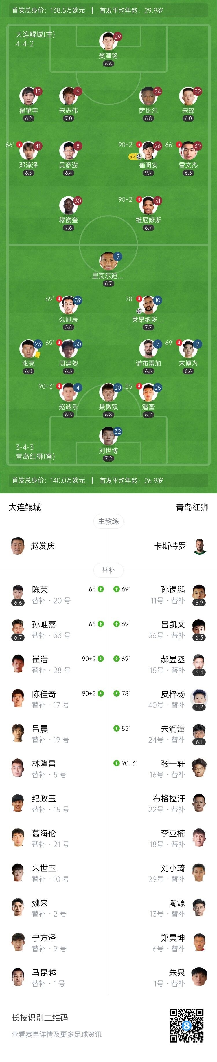 伤停补时10分钟。全场比赛结束,大连鲲城2-1青岛红狮。