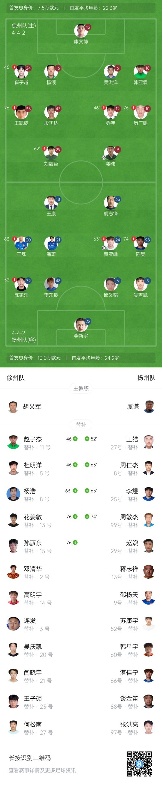 第59分钟,徐州扳平比分!左路角球机会开到禁区门前姜伟头球破门,徐州1-1扬州。↓