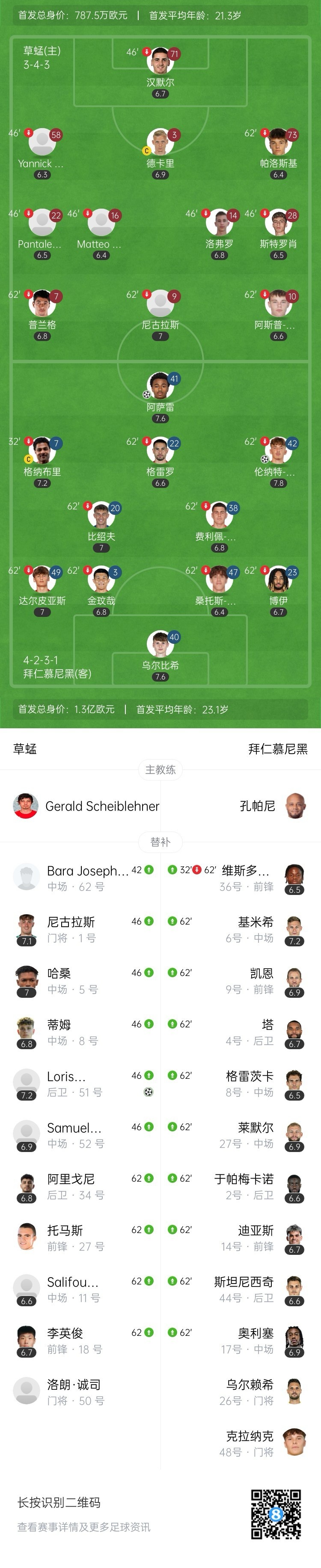 第54分钟,拜仁进行大规模换人,凯恩等主力球员登场。↓