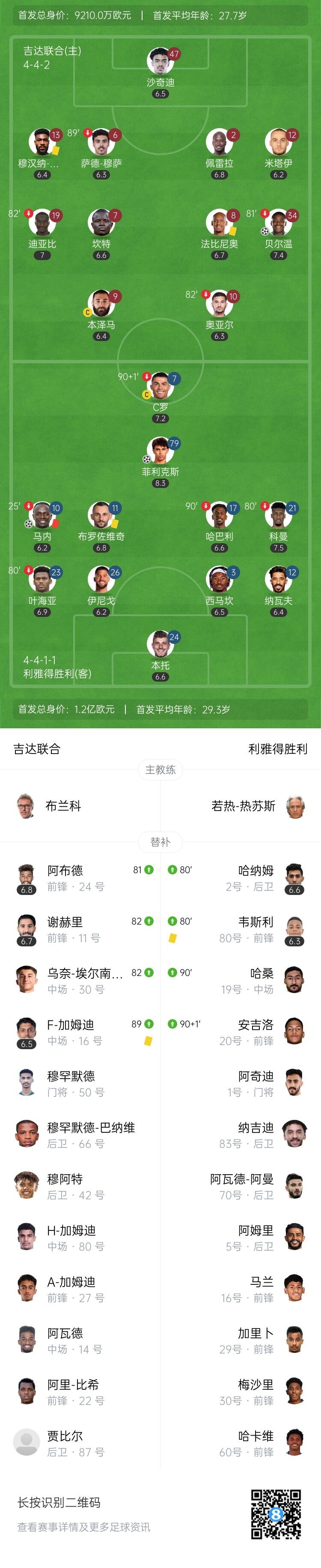 伤停补时7分钟。全场比赛结束,吉达联合1-2利雅得胜利。