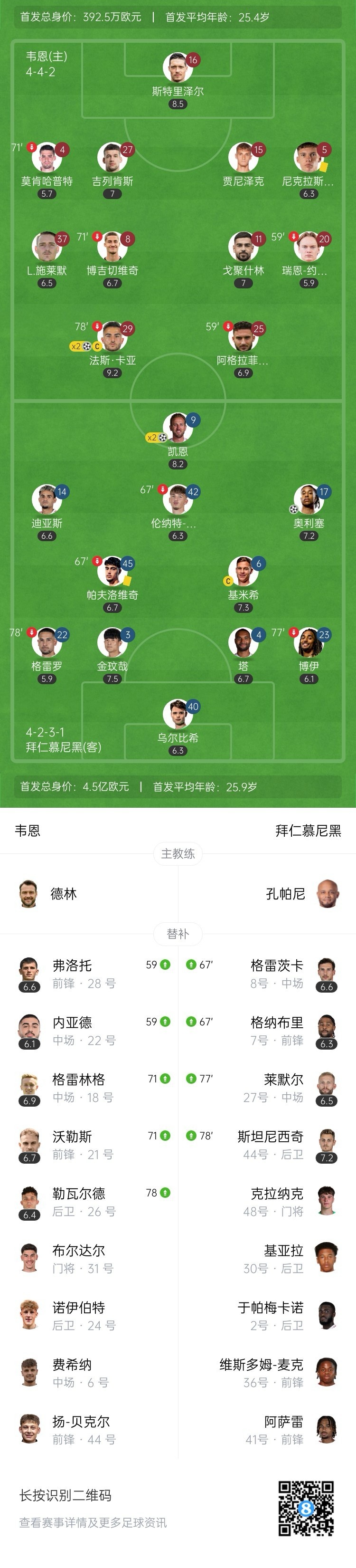 全场比赛结束,拜仁慕尼黑客场3-2险胜德丙队韦恩。↓