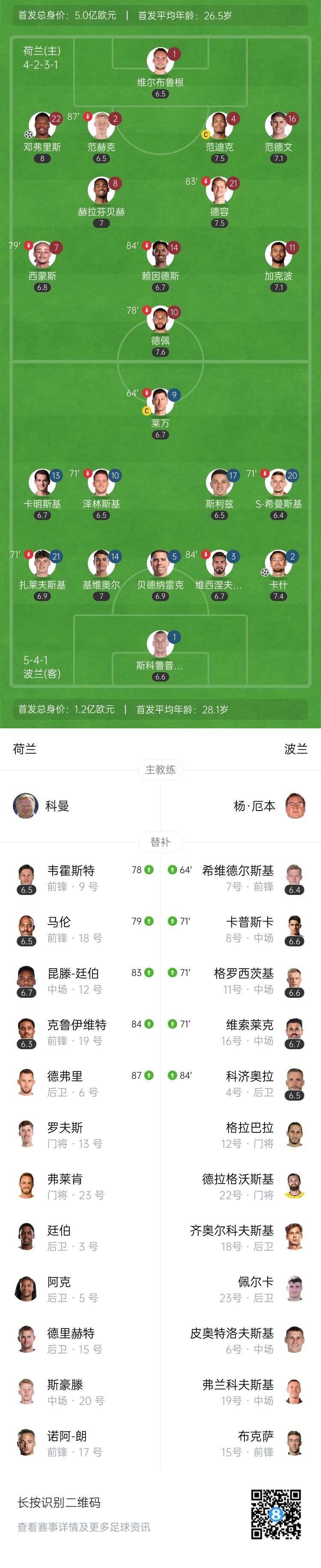 全场比赛结束,荷兰主场1-1战平波兰。