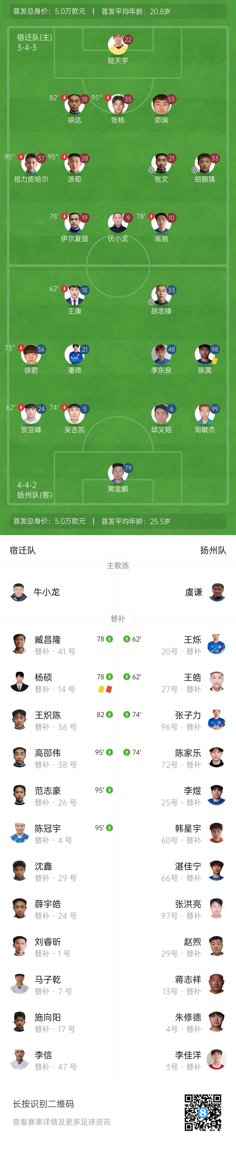 第20分钟,宿迁队左路传中,张文门前抢点头球攻门入网,宿迁1-0扬州!↓