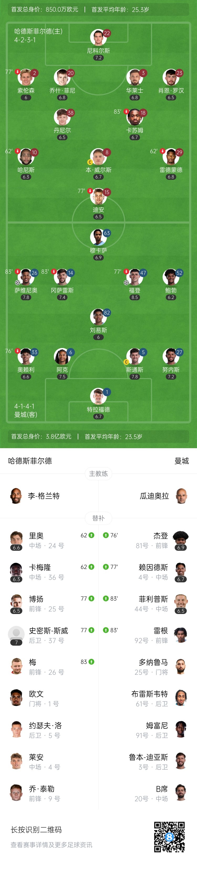 下半场补时3分钟。最终全场比赛结束,哈德斯菲尔德0-2曼城。