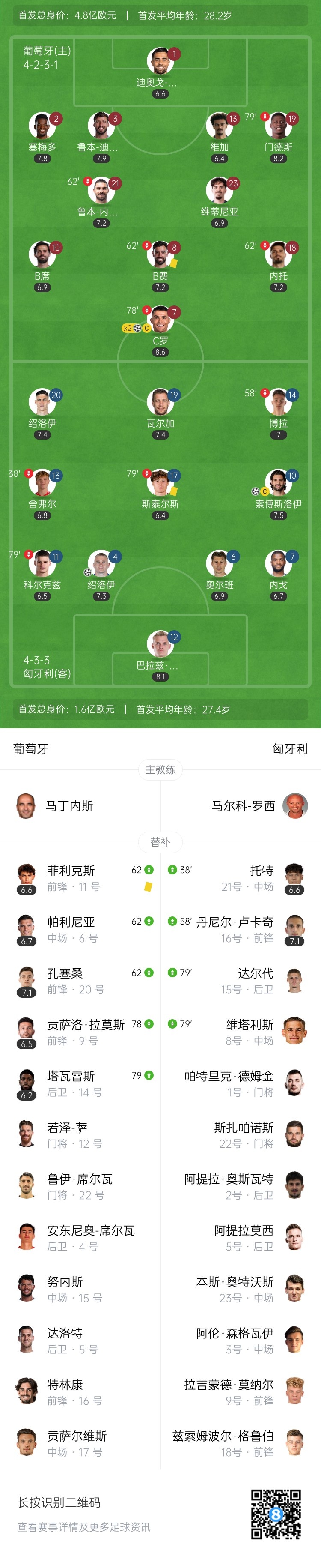 10月15日讯 世预赛欧洲区小组赛F组第4轮,葡萄牙坐镇主场阿尔瓦拉德球场迎战匈牙利。上半场,绍洛伊先拔头筹,C罗双响打进个人世预赛第41球独占历史射手王。易边再战,迪亚斯中柱,索博斯洛伊绝平。最终葡萄牙2-2匈牙利。积分榜方面,葡萄牙4轮10分无缘提前晋级世界杯,匈牙利5分第二。