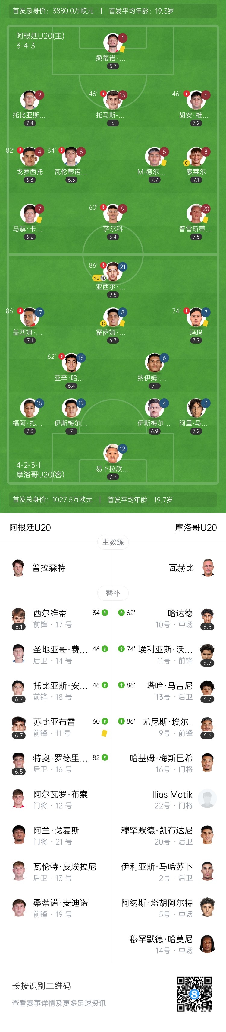 10月20日讯 北京时间7:00,世青赛决阿根廷U20对阵摩洛哥U20。上半场,阿根廷门将巴比出击放倒对手,VAR回看后判罚了黄牌+任意球,扎比里任意球直接破门!随后摩洛哥反击,扎比里再下一城!下半场,阿根廷两度提出VAR挑战,均未判罚点球!