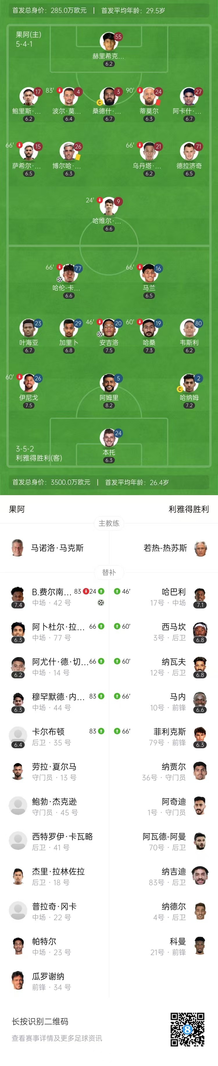 第40分钟,胜利中场断球后被反断,费尔南德斯禁区左侧抽射扳回一球,果阿1-2利雅得胜利。↓