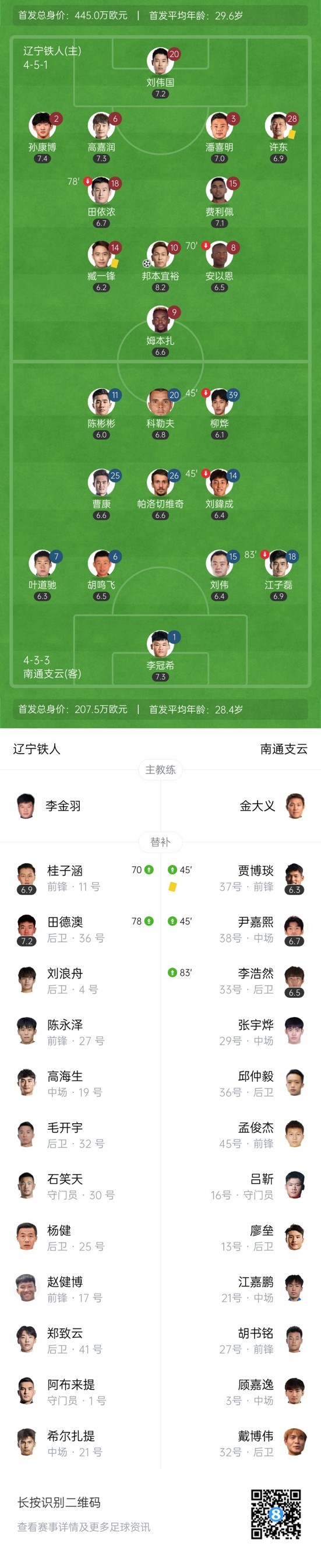 下半场补时3分钟,辽宁铁人1-0南通支云。