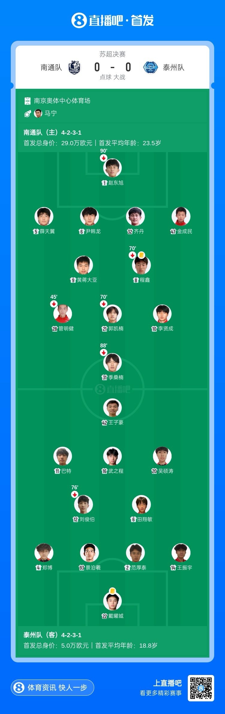 11月1日讯 北京时间11月1日19:35,江苏联决赛在南京奥体中心体育场上演,南通队对阵泰州队。上半场,南通队稍稍占据场上优势,双方均没有取得进球;下半场,范厚泰单刀球被赵东旭神勇扑出,两队90分钟0-0平进入加时赛。点球大战,南通队两度罚丢,泰州队4-3战胜南通队夺得冠军。