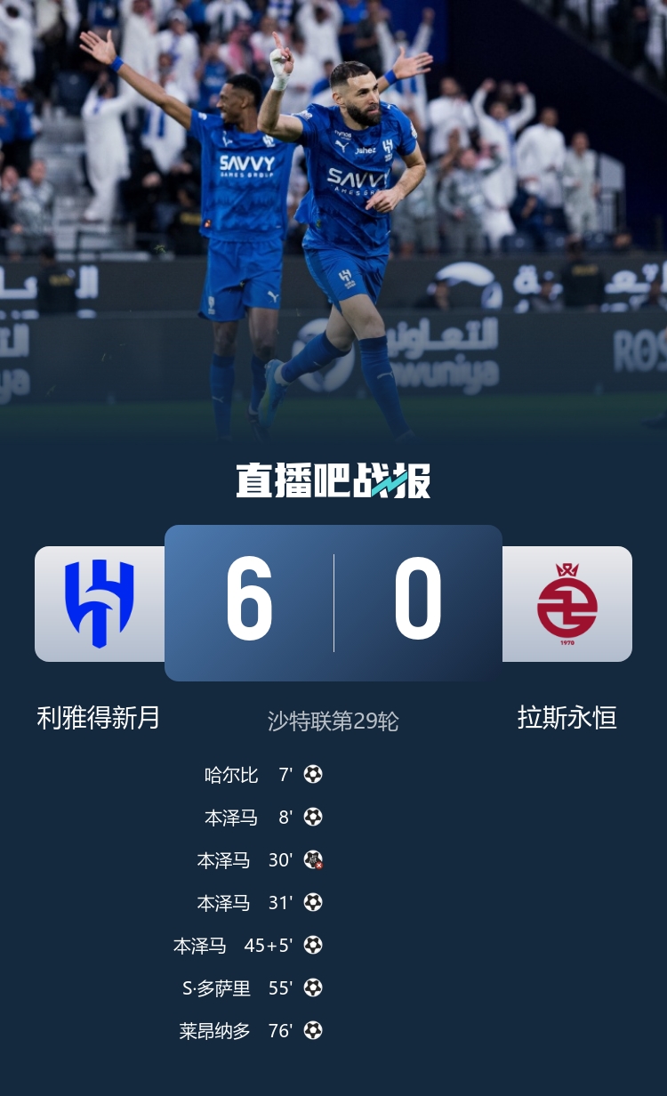 4月9日讯 北京时间4月9日凌晨2时整,2025-26赛季沙特联第29轮在法赫德国王国际体育场展开角逐,利雅得新月坐镇主场迎战拉斯永恒。上半场哈尔比首开记录,本泽马帽子戏法,马尔科姆助攻+造点,米林科维奇两助攻,下半场多萨里和莱昂纳多破门,本泽马助攻。最终利雅得新月主场6-0大胜拉斯永恒,新月联赛28轮不败,先赛积68分位居第2名,距榜首胜利2分。