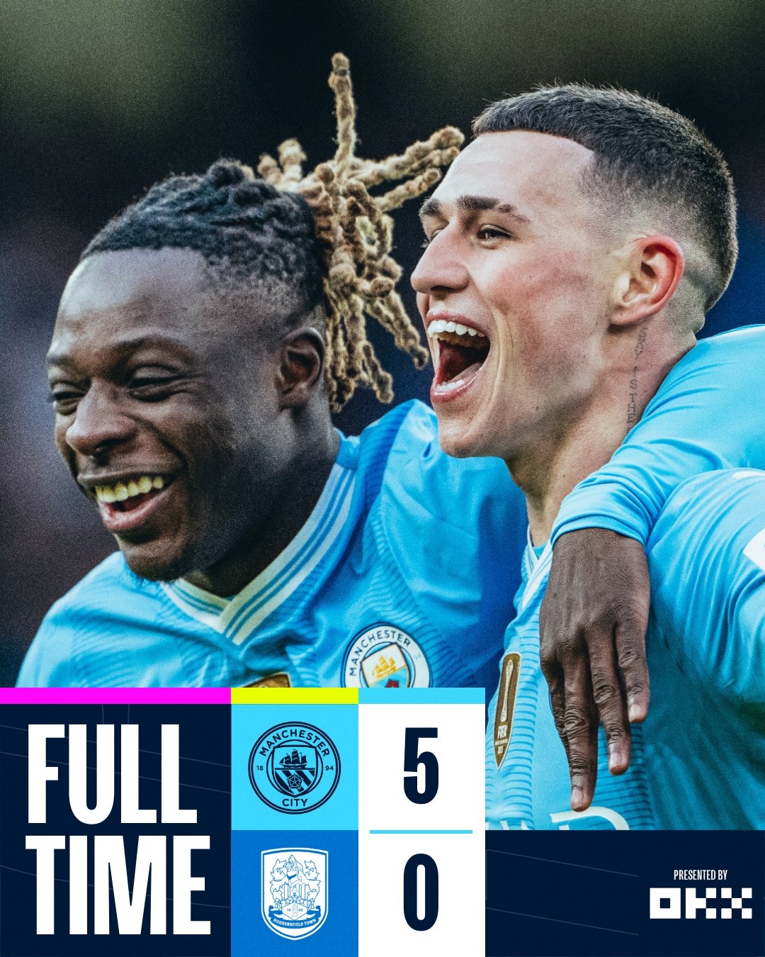 全场比赛结束,曼城5-0大胜哈德斯菲尔德晋级下一轮。