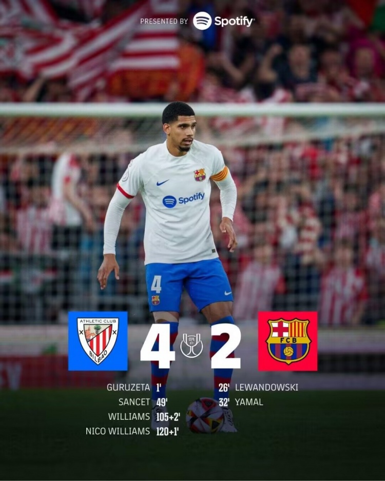 1月25日讯 国王杯1/4决赛,巴萨对阵毕尔巴鄂。上半场开场仅38秒,巴萨后防解围失误,古鲁泽塔闪击破门,莱万同样也是利用毕巴解围失误扳平比分,亚马尔一条龙内切远射反超比分。易边再战桑塞特头槌破门扳平,亚马尔两次错失单刀。常规时间巴萨2-2毕巴进入加时赛。加时赛上半场补时,伊纳基关键破门,下半场补时,尼科锁定胜局。最终巴萨加时鏖战2-4不敌毕巴止步八强。