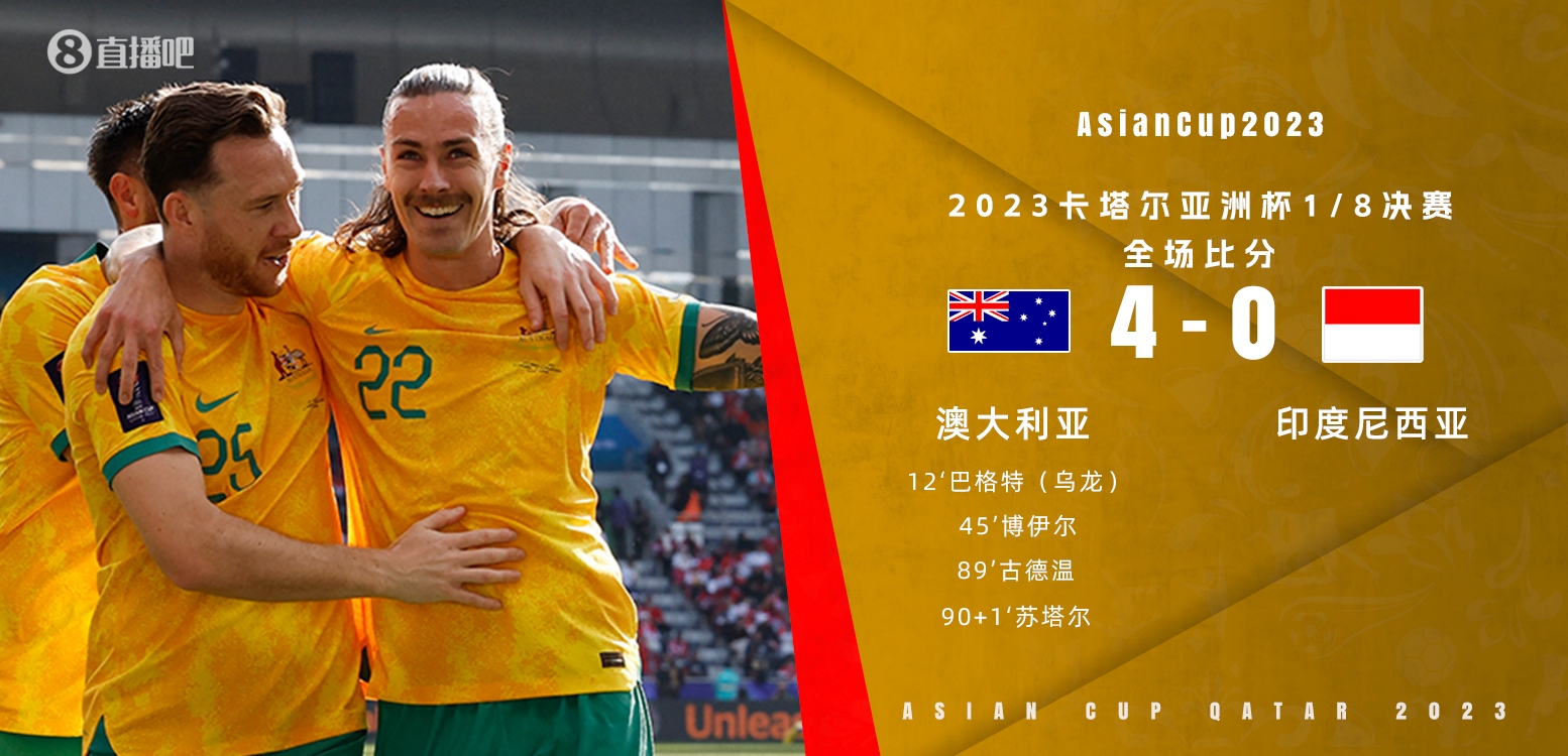 亚洲杯-澳大利亚4-0印尼进八强将战韩国vs沙特胜者 古德温传射