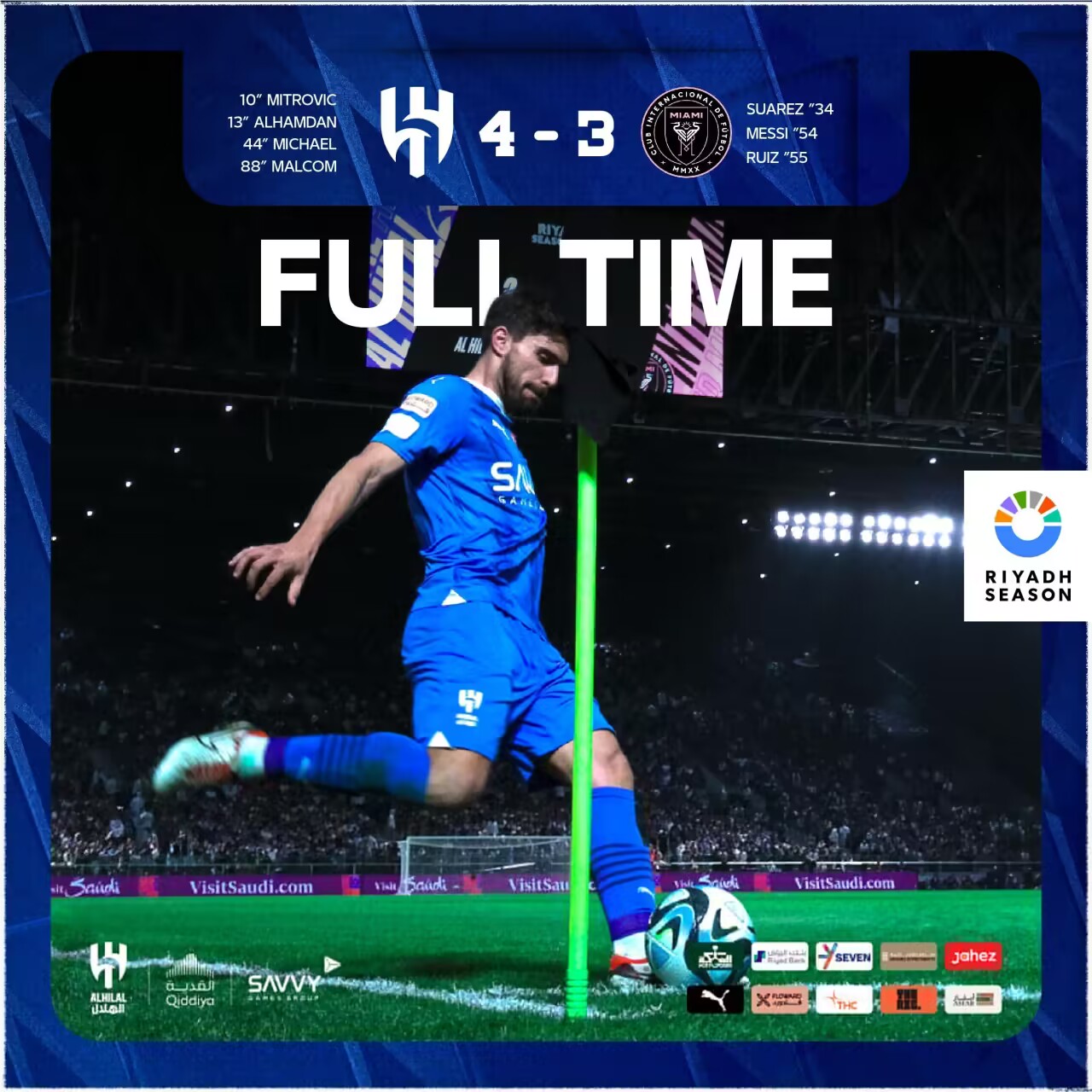 第89分钟,利雅得新月绝杀!右路沙赫拉尼传中到禁区马尔科姆头球破门,利雅得新月4-3迈阿密国际。↓