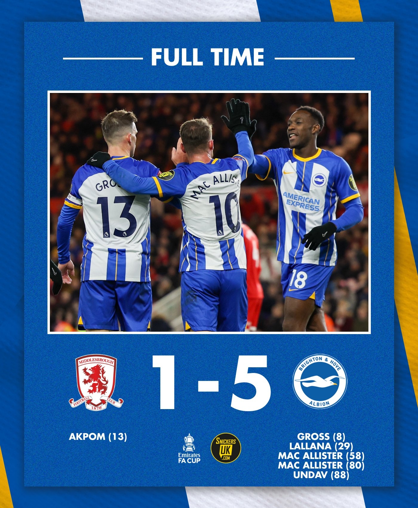 足总杯布莱顿5-1米堡晋级,麦卡利斯特替补双响+脚后跟破门