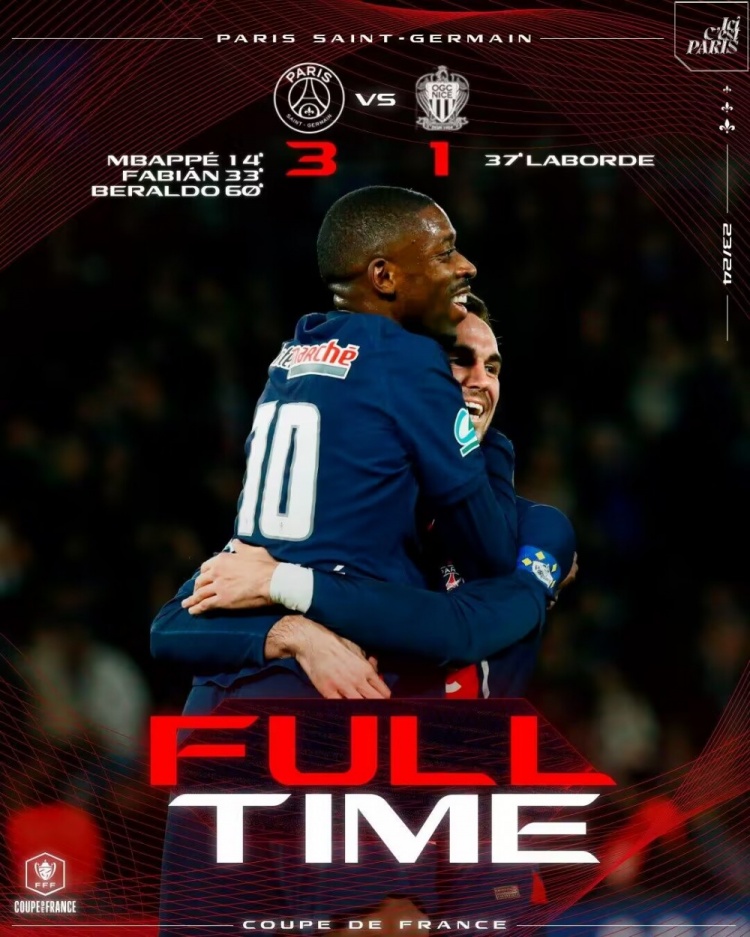 法国杯-巴黎3-1尼斯时隔两赛季再进半决赛 姆巴佩破门+打满全场