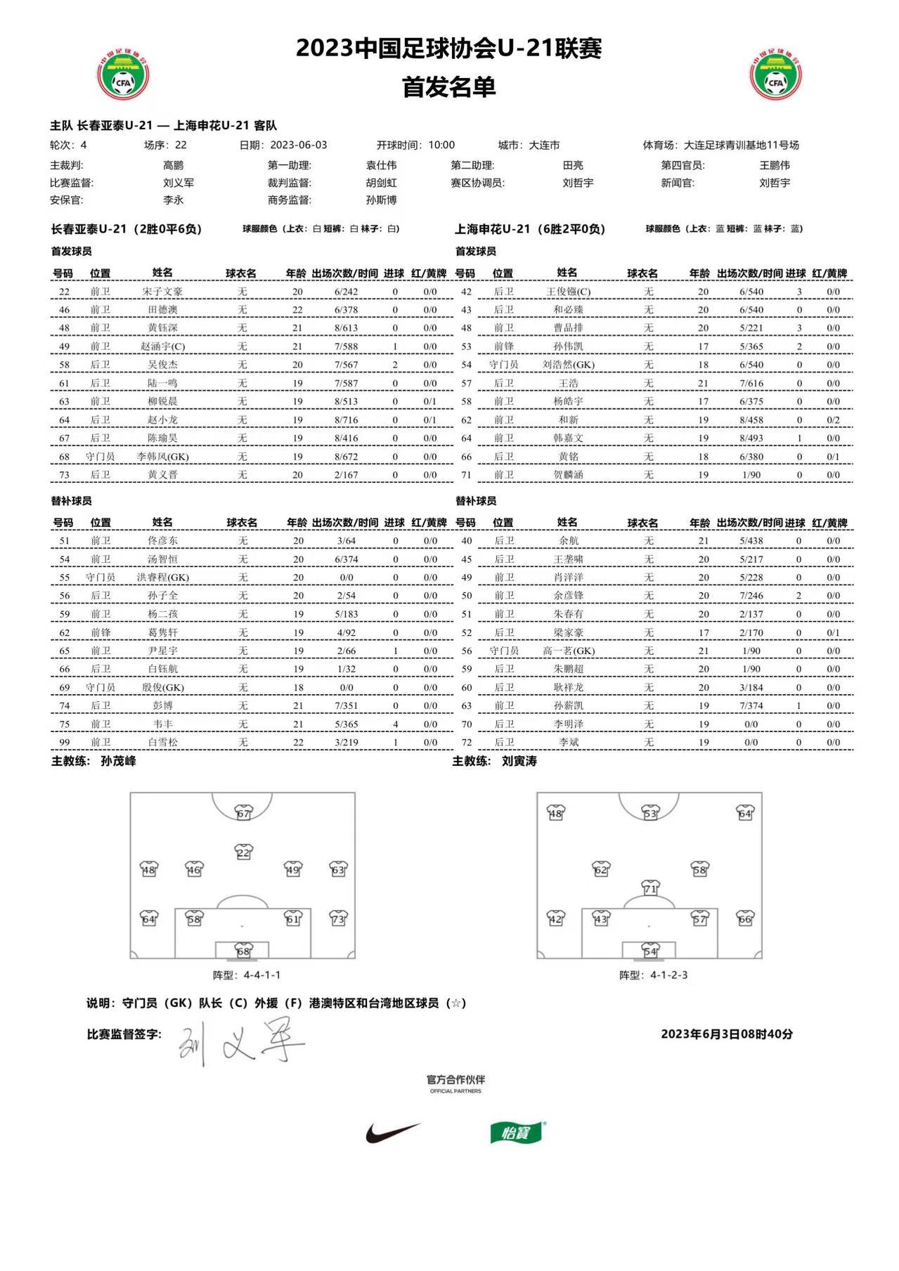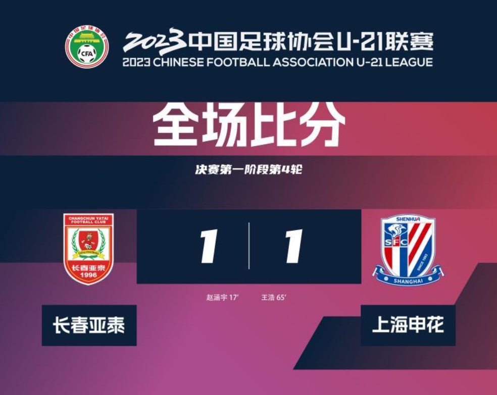 U21联赛:长春亚泰1-1上海申花,赵涵宇、王浩破门