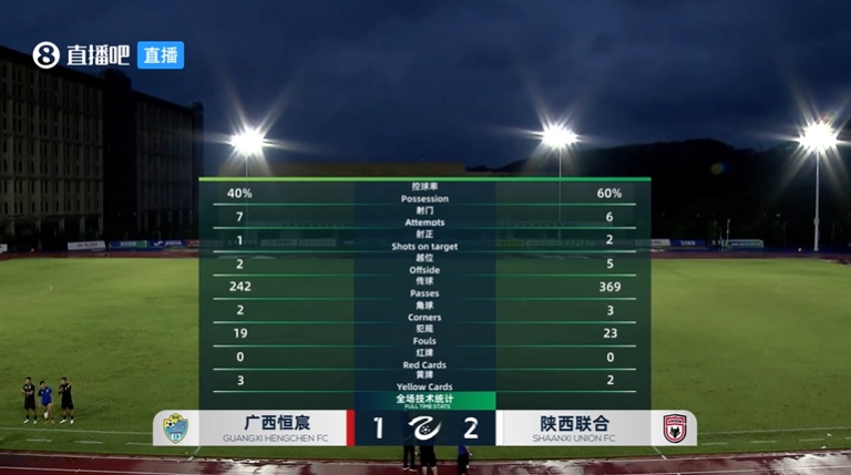 下半场补时6分钟,广西恒宸1-2陕西联合。