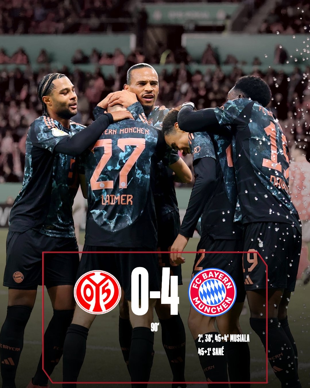 德国杯-穆西亚拉半场戴帽萨内建功 拜仁4-0美因茨晋级下轮