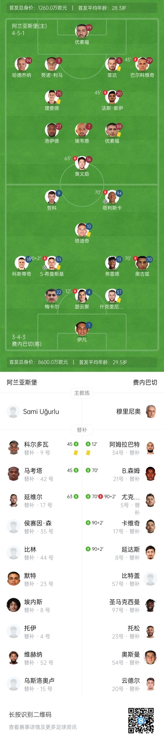 下半场补时6分钟,阿兰亚斯堡0-2费内巴切。