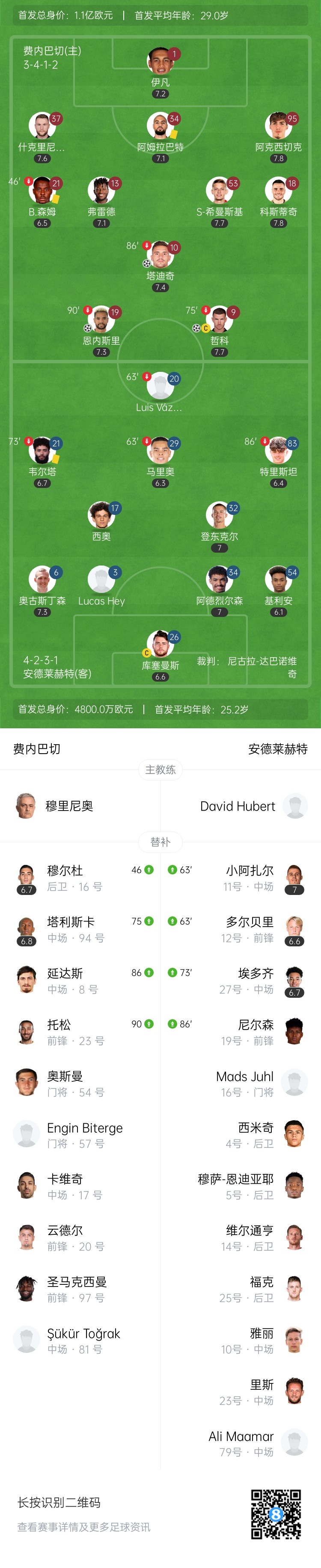 第11分钟,费内巴切的左侧角球,皮球被顶出来,随后再次传中,前点阿奇切克头球一蹭,门前塔迪奇将球顶进球门!费内巴切1-0领先安德莱赫特↓
