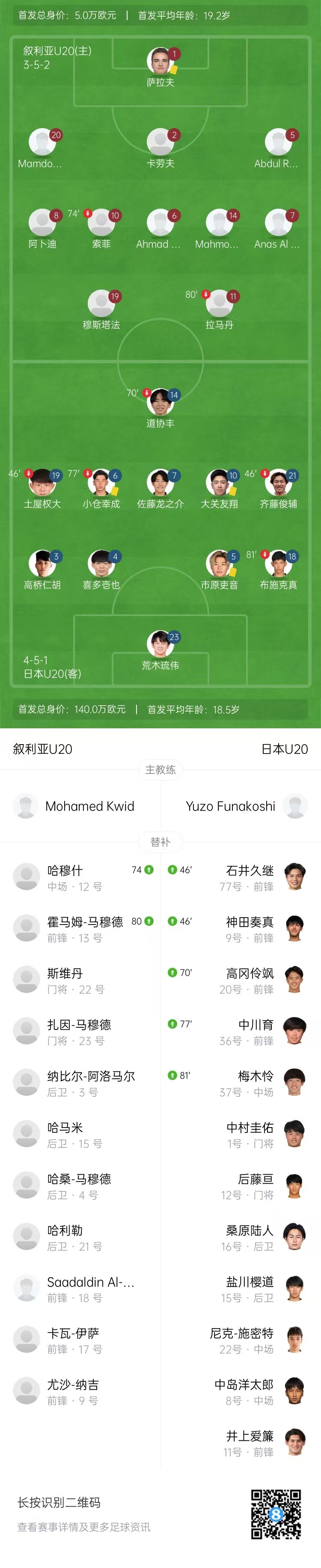 全场比赛结束,日本U20队2-2叙利亚U20队。