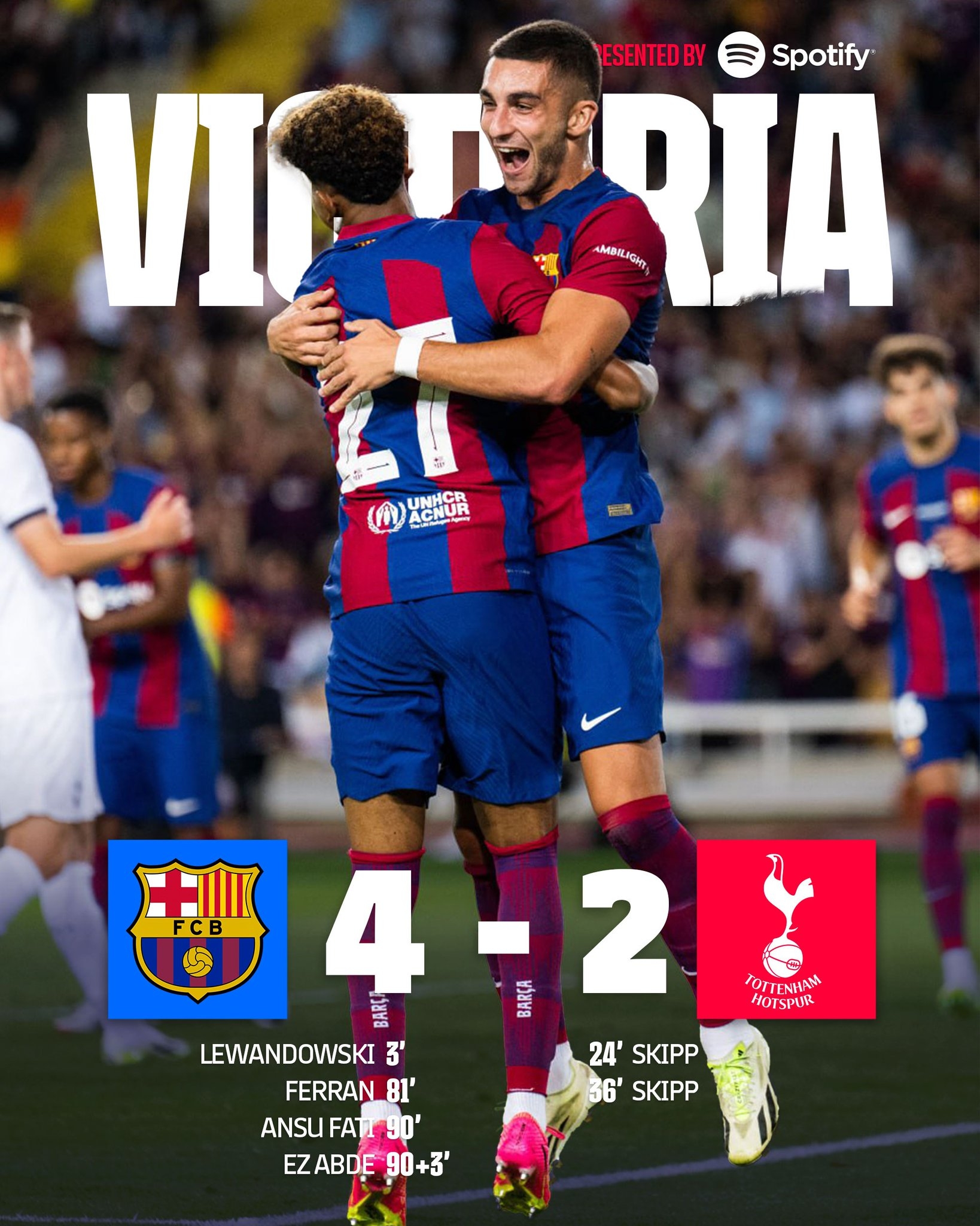 第93分钟,亚马尔直塞,费尔明插上低平球传中,无人盯防的阿布德推射得手,巴塞罗那4-2热刺!↓