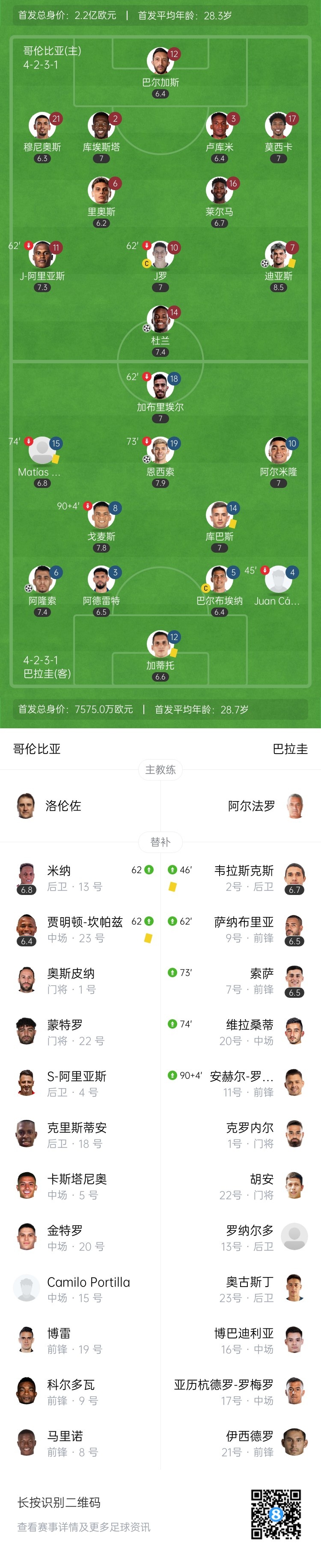 全场比赛结束,哥伦比亚2-2巴拉圭。