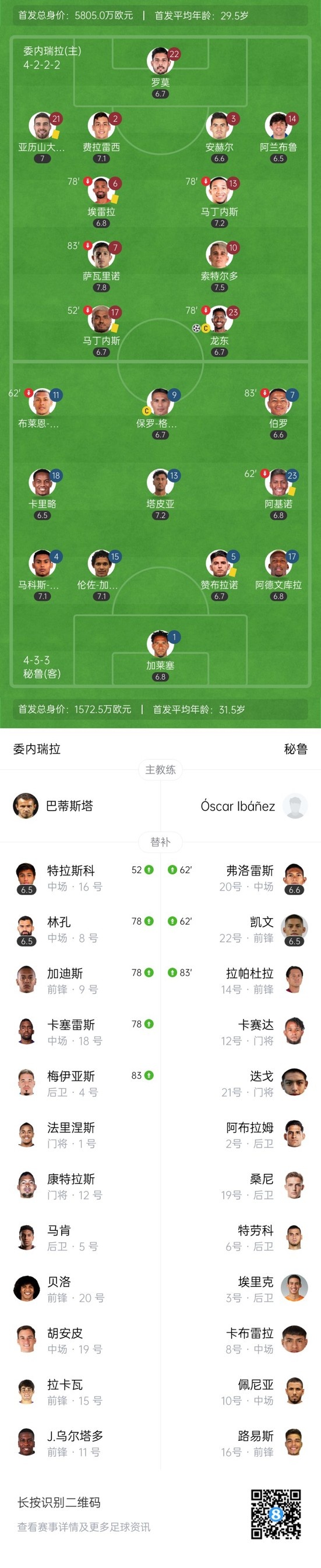 下半场补时5分钟,委内瑞拉1-0秘鲁。