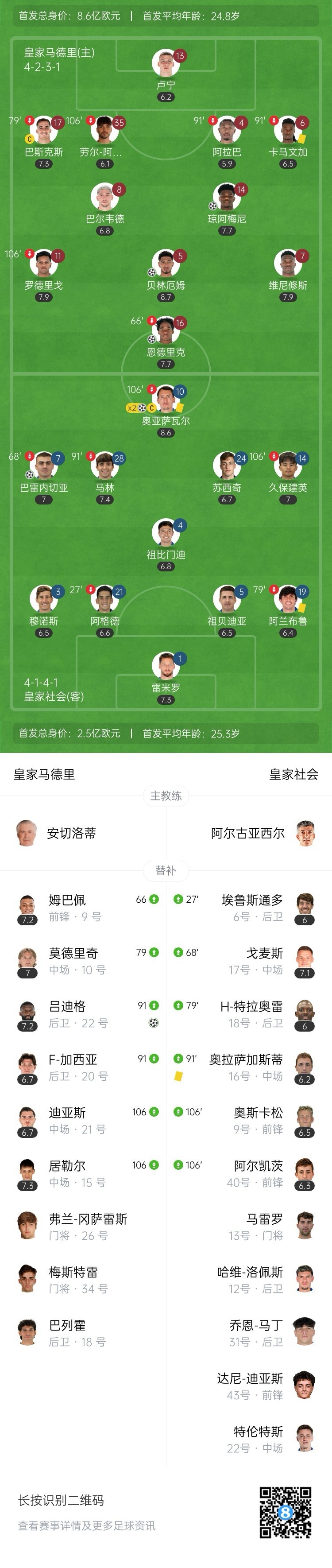 第85分钟,维尼修斯带球突入禁区内单刀打门,球被门将扑出,随后维尼修斯跟进尝试补射,皇家社会球员将球解围!↓