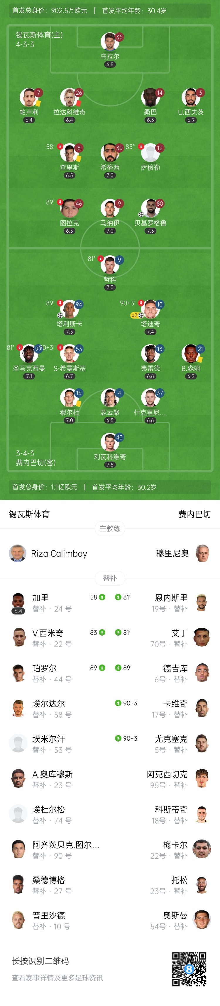 全场比赛结束,费内巴切3-1锡瓦斯体育。