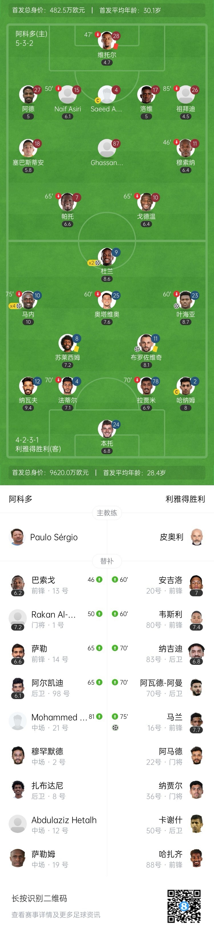 胜利客场领先!第16分钟,哈纳姆右路传中,门将维托尔摘球时与队友相撞造成脱手,叶海亚抓住机会转身扫射入网,阿科多0-1利雅得胜利!↓