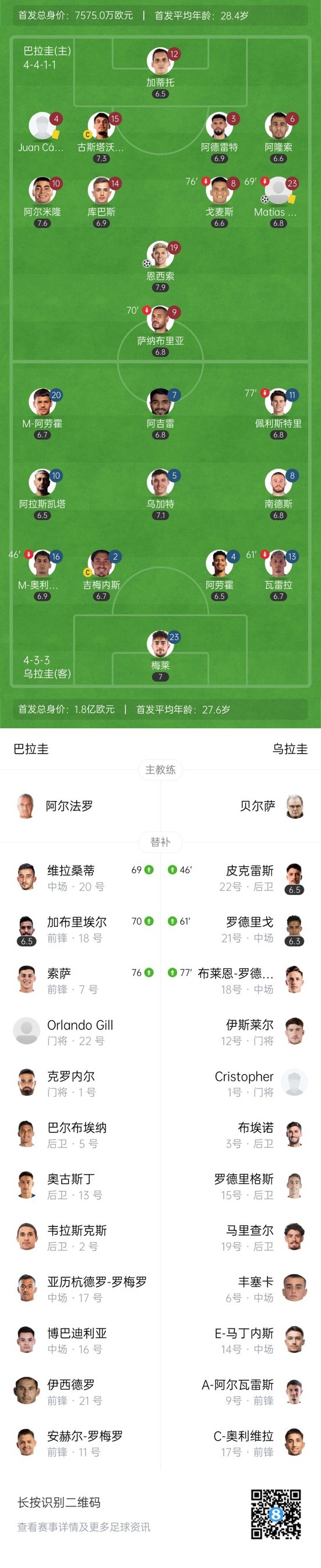 第12分钟,巴拉圭首开记录!恩西索右路下底传到门前前点防守球员解围不远后点梅莱出击失误加拉尔萨头球破门,巴拉圭1-0乌拉圭。↓