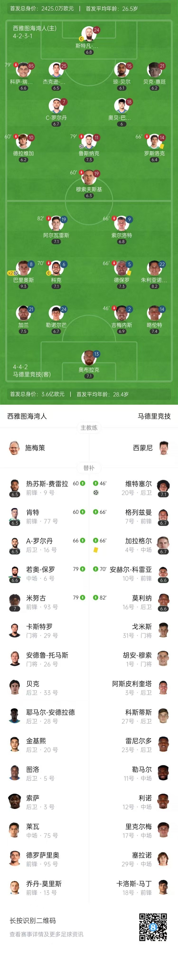 全场比赛结束,马德里竞技3-1西雅图海湾人。