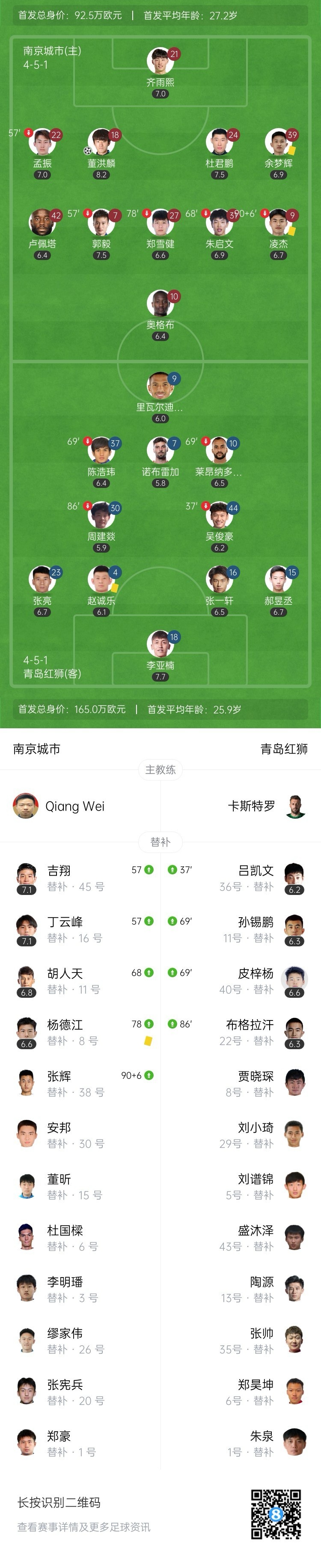 止三连败!南京城市2-0青岛红狮 董洪麟头球破门卢佩塔补时建功