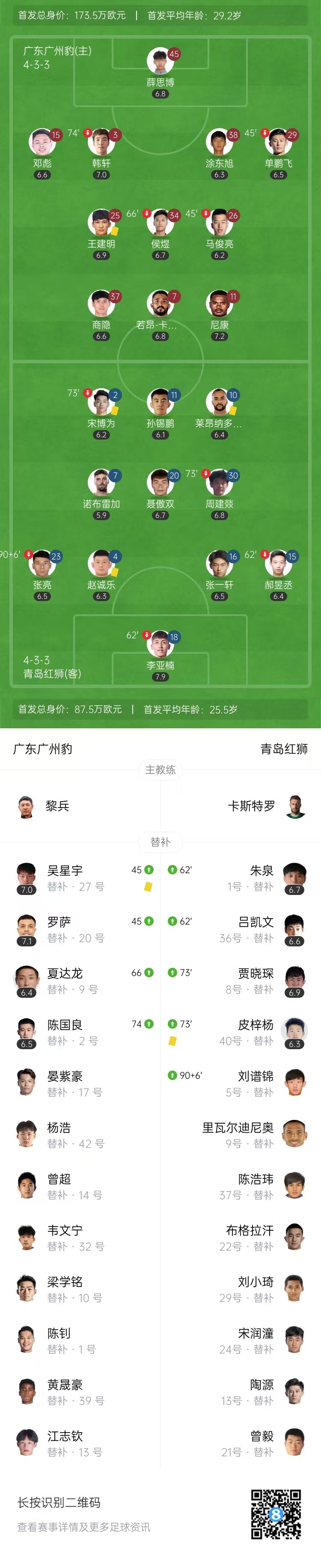 全场比赛结束,广东广州豹0-0青岛红狮。
