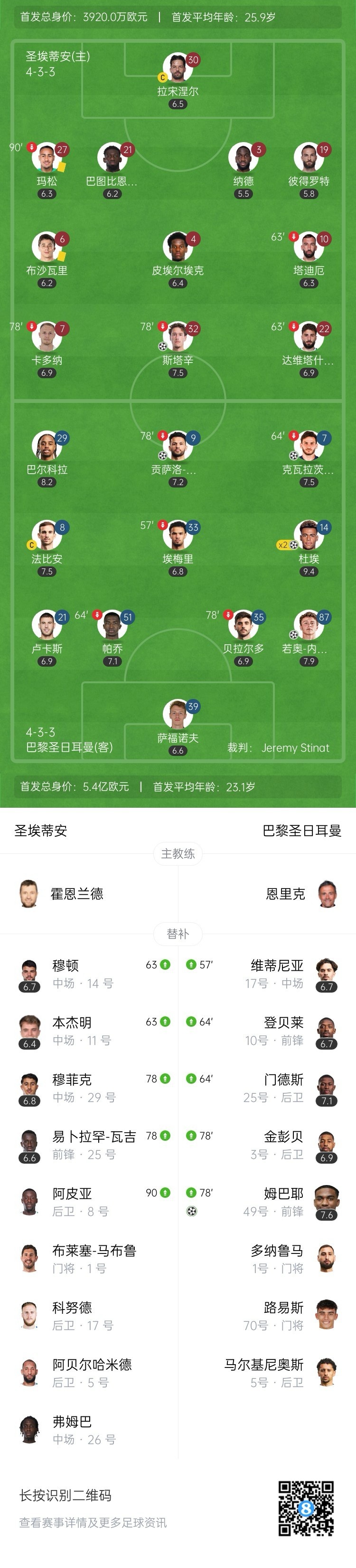 第9分钟,达维塔什维利禁区左侧下底倒三角回敲,斯塔辛跟进头球攻门顶进,圣埃蒂安1-0领先!↓