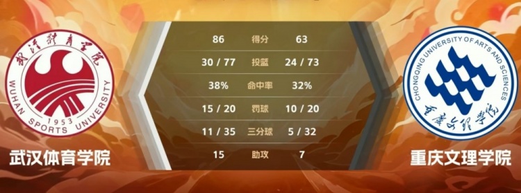 重庆文理:周思蕴22分18板、秋菊14分5板、张玉欣8分、刘艺7分5板、胡瑞珂6分、杨屿桐6分