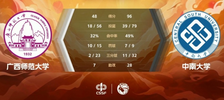 次节广西师大进攻端手感依旧不好,他们5分钟里仅得6分,这其中罗欣包揽4分外加一次助攻;中南大学则延续快节奏反击,陈茂姿和梁雨昕相继命中三分,田媛媛则反击2+1打成帮助中南大学拉开20分的优势。末段广西师大彻底熄火,整个上半场25投8中,其中三分球8投0中;中南大学方面数据全面领先,末段送上一波11-2的攻势并以53-25领先广西师大。
