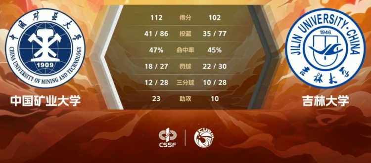 末节开局花志成和林晓峰的进球两度为球队追至8分但都无力再进一步,中国矿大总能关键时刻拿分,艾渝和肖恺的相继得分一直维持领先,随后在吉林大学哑火的阶段又依靠9-4的攻势拉开15分的优势奠定胜局。这之后中国矿大打得更加稳定一直确保优势。最终,中国矿业大学112-102击败吉林大学拿下比赛。