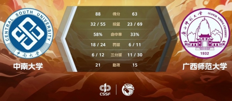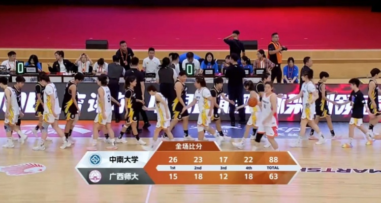 末节手握大比分优势的中南大学稳扎稳打,进攻端依旧以田媛媛和居百惠冲击篮下为主,辅以梁雨昕的三分继续占据上面上风;广西师大则依旧处于劣势无力做出应对,赵苗虽然开局命中三分,但随后继续抢攻的4次三分出手无一得手。最终,中南大学88-63轻取广西师范大学顺利拿下比赛。