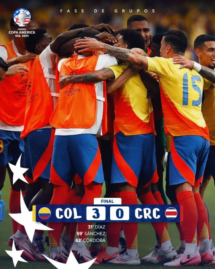 6月29日讯 北京时间6月29日早晨6时,美洲杯小组赛D组第2轮,哥伦比亚对阵哥斯达黎加。上半场,迪亚斯点球破门首开纪录。哥伦比亚半场1-0领先哥斯达黎加。下半场,桑切斯和科尔多瓦相继破门,J罗贡献了一次助攻。最终哥伦比亚3-0击败哥斯达黎加,取得两连胜提前小组出线。