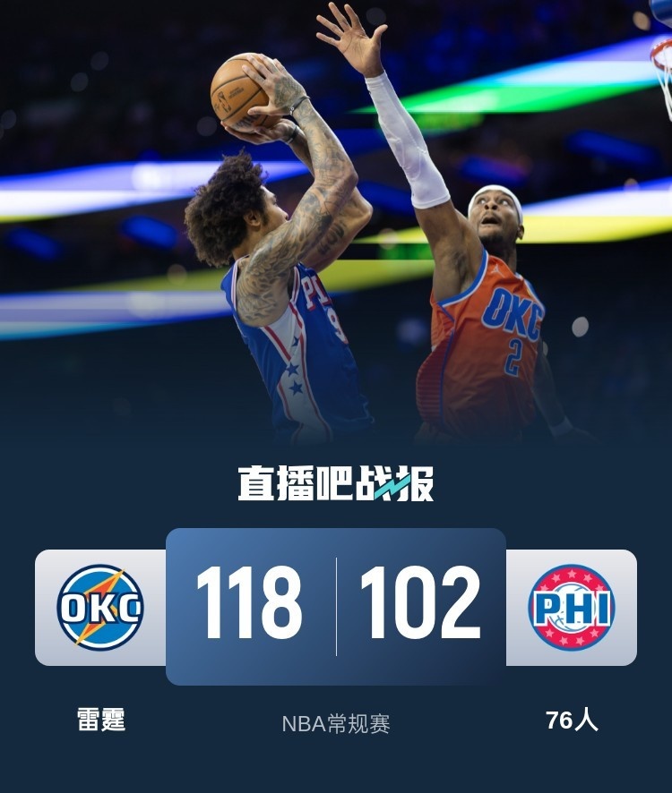 比赛开始,雷霆首发五虎开局7中7助队顺势建立主动权,随后雷霆进攻端继续发力,亚历山大单节6中6带队轰出22-2超级攻击波拉开20分以上领先,次节雷霆进攻端有些停滞且连续失误,76人全民皆兵追分,但亚历山大上来后有攻有传带队稳住局势,半场雷霆还领先15分。下半场,爱德华兹接连三分联手道丁助队追分,亚历山大连续突破强势回应守住领先,随后亚布塞莱里突外投连砍7分,压哨补篮后76人追到差6分,末节76人接连三分继续缩小分差,但杰伦威三分止血,乔和华莱士接连三分重新拉开近20分领先,最终雷霆118-102战胜残阵76人,拿到3连胜同时送对手3连败。
