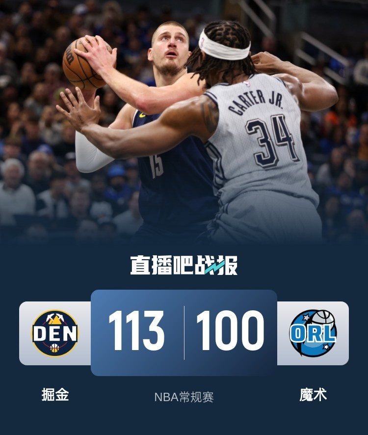 比赛开始,魔术上来打出8-3不错开局,随后约基奇开启进攻模式带队追分,但魔术全民皆兵回应首节保持微弱领先,次节魔术接连三分命中,一波13-4小高潮直接拉开双位数领先,但穆雷接连中投带队咬住比分,随后约基奇接连罚球反超比分,半场掘金反超2分。下半场,掘金众将开始发力,小波特里突外投得分上双,布劳恩接连反击,掘金拉开双位数领先,随后穆雷里突外投连砍10分,掘金三节领先到16分,约基奇三节又达成三双,末节戈登里突外投带队拉开20分以上领先,随后双方换替补练兵,最终掘金113-100轻取魔术,送对手3连败。