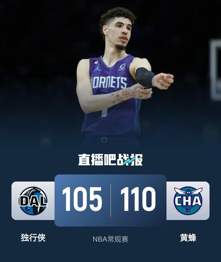 一开场,两队势均力敌,比分交替领先,加福德强攻内线频频得手,独行侠稳扎稳打保持场上优势,拉梅洛-鲍尔连中三分,半场战罢双方战成55平。下半场,双方依旧打得难解难分,比分始终紧咬,末节欧文连得11分,黄蜂多点开花还以颜色,双方争夺陷入白热化,关键时刻独行侠失误,克莱绝平三分不中,最终,独行侠105-110不敌黄蜂。