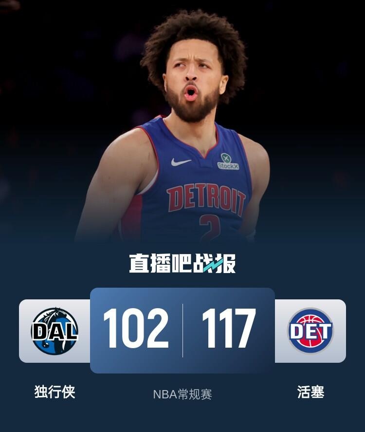 比赛开始,克莱连得8分带队取得两位数优势,康宁汉姆联手杜伦展开反击,活塞不断蚕食分差,次节华盛顿和加福德攻防两端发力,但康宁汉姆高效输出,活塞多点开花强势反超,加福德连送大帽,半场战罢独行侠58-62落后活塞。易边再战,活塞持续发力打出13-1将分差拉开到15分,欧文单节14分止血,末节萨瑟连续拿分带队重获两位数优势,独行侠苦苦追赶无果,最终,活塞117-102击败独行侠,主场过关。